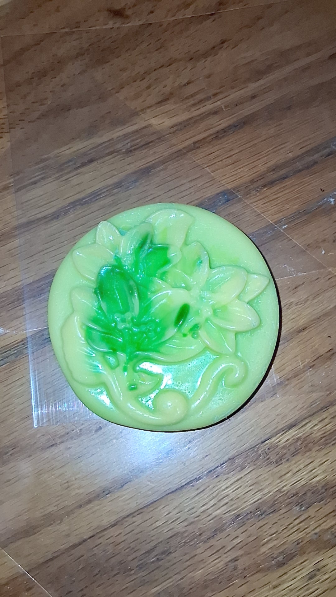 This beautiful flower contains an almost tye dye mix of golden and green. It contains a sweet scent of vanilla and a dash of coffee fragrance. The oils made with this soap is Castro and Sunflower. This is personalizable item!